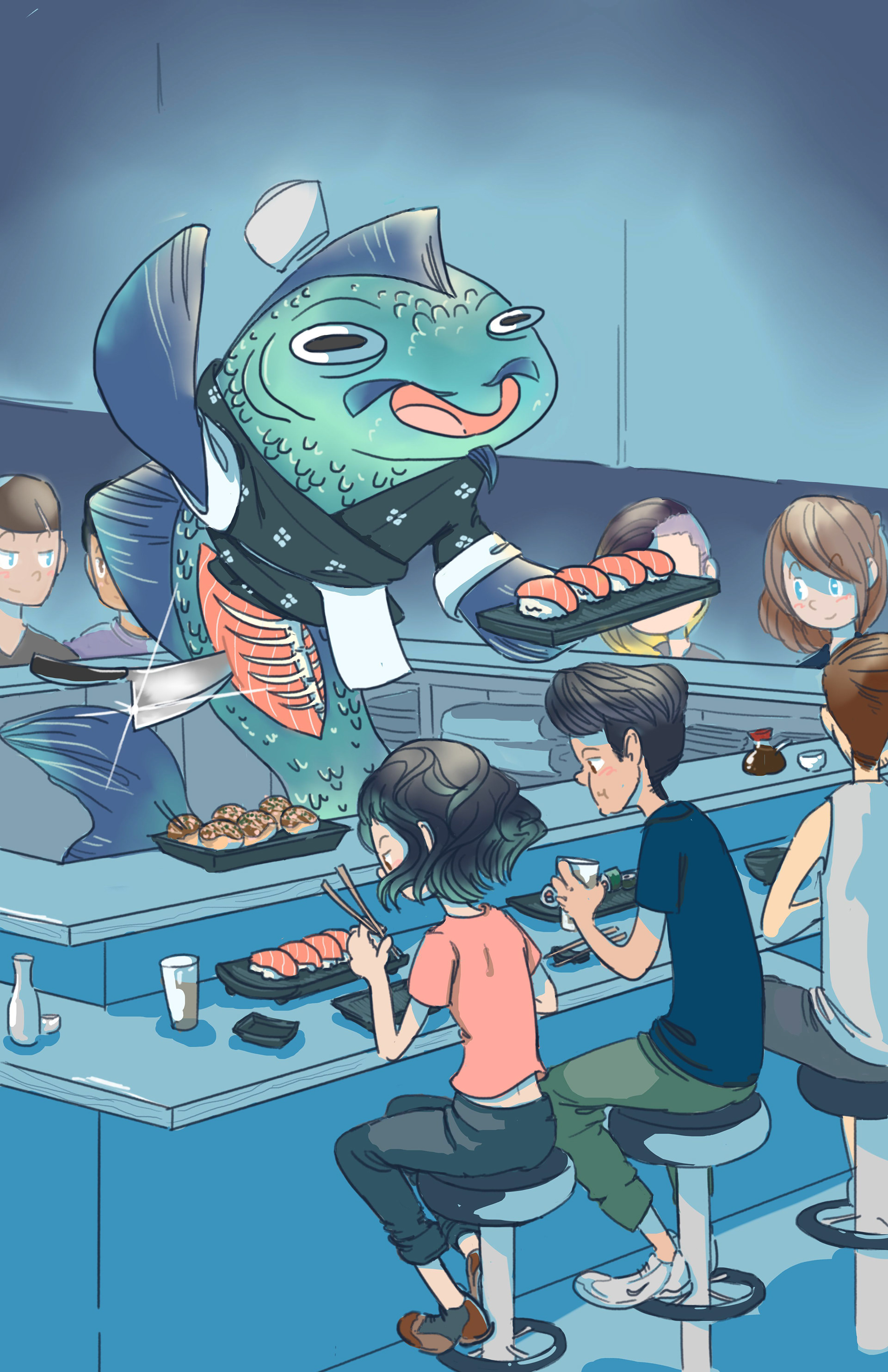 An illustration about a tuna chef that puts a little too much of himself in his work.
